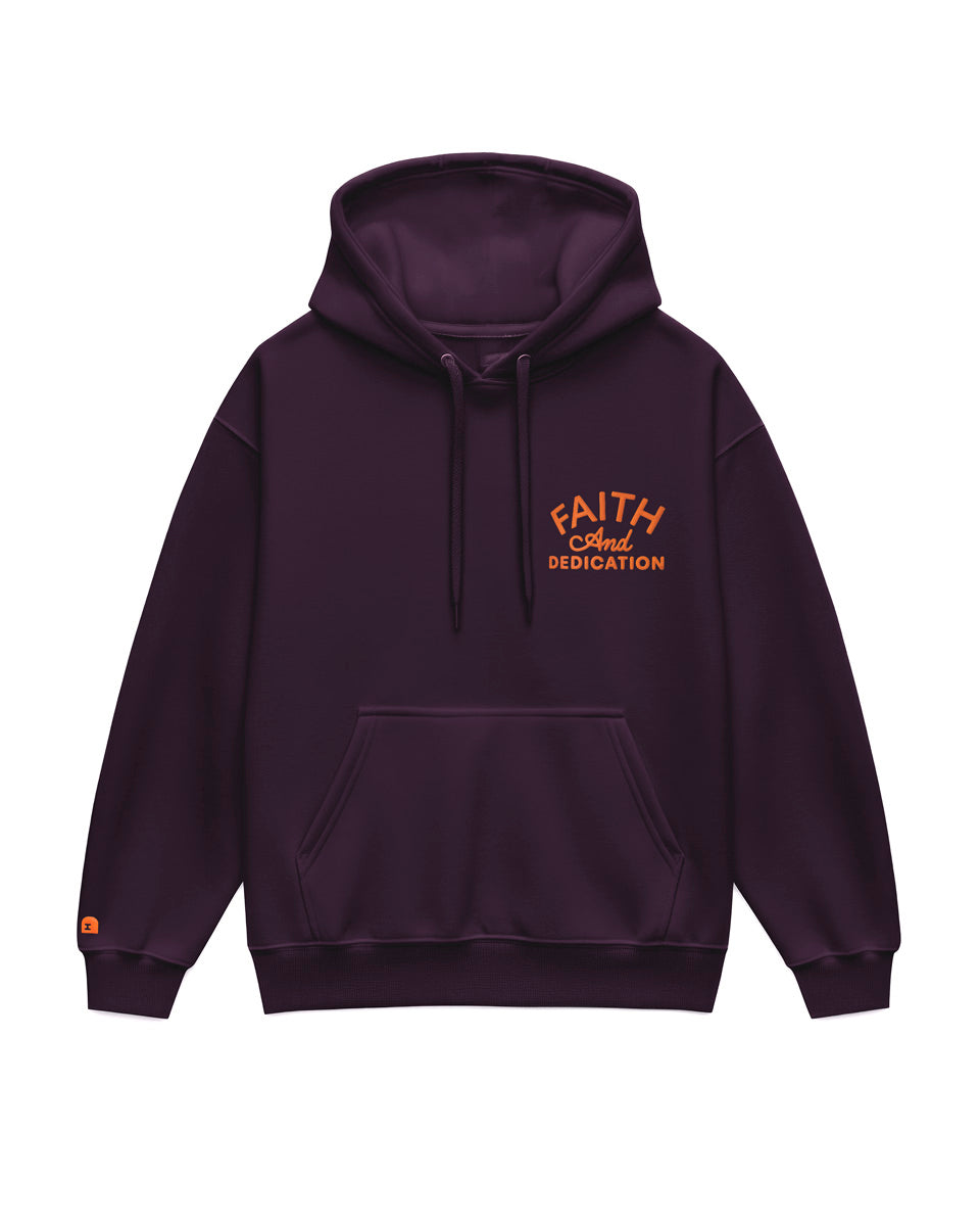 Built By Faith hoodie in plum, with orange puff print. This is a regular fit, mid-weight hoodie with a soft hand feel. Made from 80% cotton and 20% recycled polyester, anti-pill fleece. It has a 3 piece hood for a better fit, tonal drawcord, and it's preshrunk to minimize shrinkage.