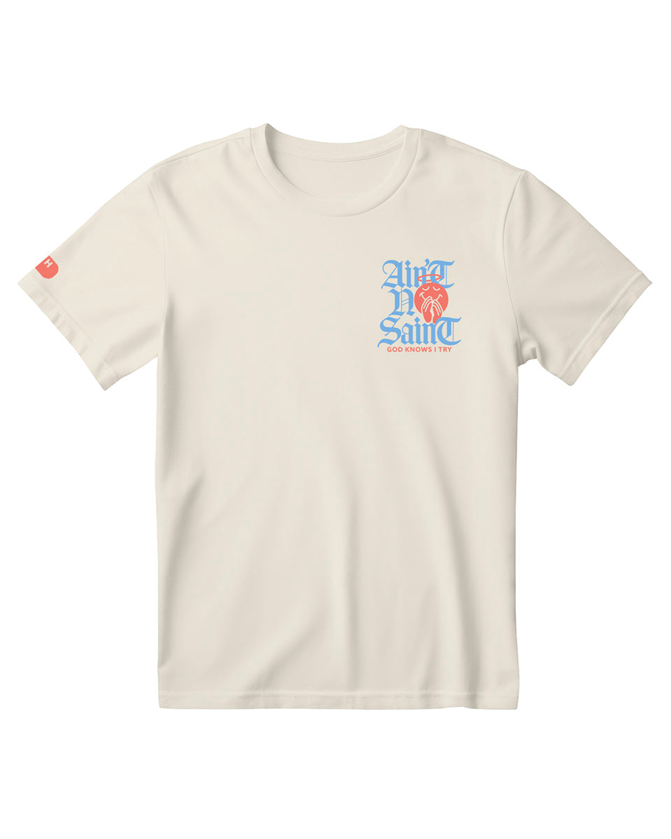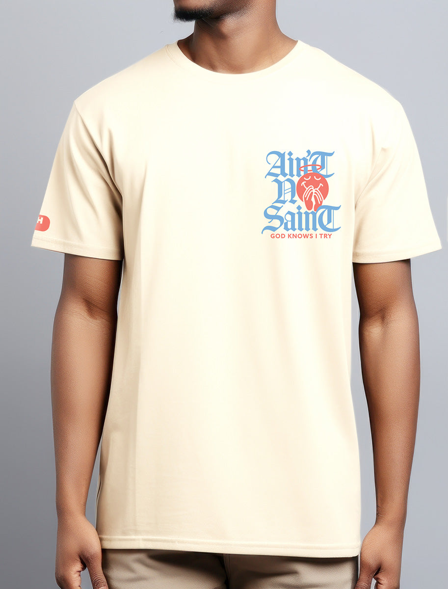 Ain't No Saint. But God knows I'm trying. 100% soft cotton with chest and back graphic. This is a mid-weight tee with a relax fit. Continue to grow your faith and stay blessed.